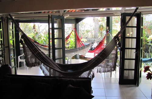 House of differentiated architecture with 4 bedrooms, two suites, 1 mezzanine (3x4), 4 bathrooms. Large room 12 meters long with three rooms, 16 door blades opening onto the balcony. Well-equipped kitchen with 2 refrigerators and freezer and wooden counter that connects this area with the living room and serves breakfast. Private pool, 6 min. from Feiticeira Beach. Balcony with hammocks, covered barbecue with table and chairs, by the pool. The house is very airy with white tiled floors and ceiling fans in every room including the living room and air cond. in the 04 rooms. We accept a maximum of ten guests, and we prefer families. The house is all walled with stones for added security. 3 car garage with automatic gate, outdoor shower for summer bath. All rooms in the house have air conditioning and a ceiling fan.