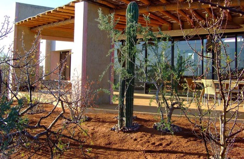 The unique architectural design of the house blends organically with the desert environment due to its rustic building materials. The sliding doors of all the main rooms open to create an integrated indoor/outdoor living space. The house has been constructed with many natural materials and furnished with locally crafted furniture. Our intent was to create a true retreat from every-day busy living.