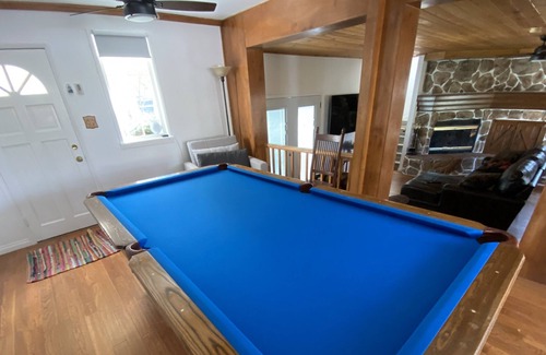 The tall side of the house has one huge bedroom and one large community space with leather couches and pool table. There’s a small kitchenette downstairs as well. The single story side has 2 bedrooms one with queen bed and one with bunk beds and 2 single sleeper sofas. Full Kitchen and pantry with washer and dryer and a very large outdoor space to enjoy the sunsets.