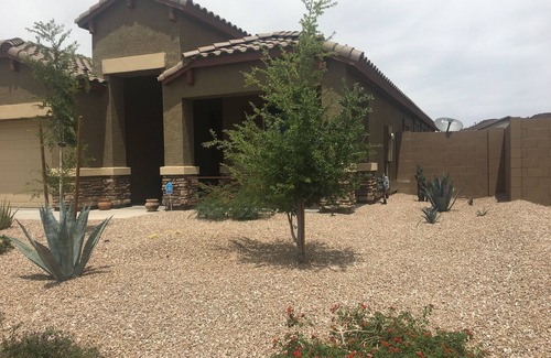 This classic New Home is in the North Peoria area near Lake Pleasant. It is near Trilogy Golf Course and many others. It is 35 minutes from Cave Creek, a true Southwestern vacation experience. Plenty of privacy yet very close to Freeways. Living Room, full gourmet kitchen with all appliances. 3 bedrooms appointed with western armories and dresser and new luxurious California King Bed and twin in 2nd bedroom. Master bedroom is a rich Hampton Pecan Bedroom with walk in closet and bathroom with tub and shower. Living Room TV , KARAOKE and DVD. Step outside for entertaining on the large stone patio with views dining table for lunches and on porch. And when the stars come out, gather around the table. BEAUTIFUL RELAXING FRON PORCH.