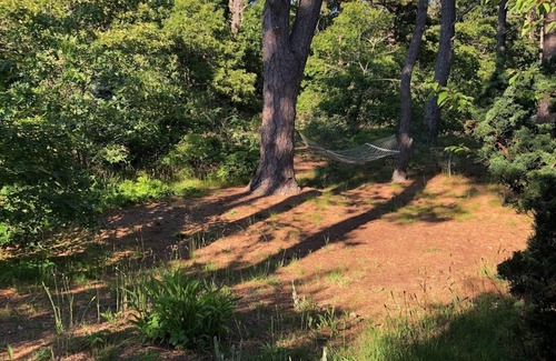 Newly listed, fully remodeled, dog friendly with prior permission. 2 bedroom, sleeping den, and 2 bathroom home designed by a professional interior designers at Spartina Interiors. This beautiful home is set on nearly an acre of naturalized landscaped yard. Centrally located to all the Outer Cape has to offer. It is within a 6 minute walk to Eastham's intimate Cole Road bay beach in one direction or within a 10 minute walk to the popular destination of First Encounter Beach and Bee's River in the other direction. One of the trail heads to the town lands and walking paths, and a pond is 200 yards from the home. The location is a short drive to Coast Guard Beach and the National Seashore or to Orleans Center and in the opposite direction to Wellfleet and the rest of the Outer Cape. This home is one of two private residences on the property that are separated by a fence to maintain privacy; each with their own driveway.
