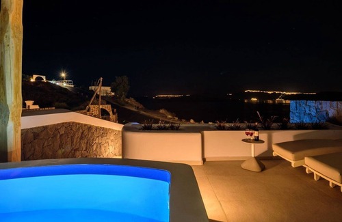Venture outside to discover your own private oasis. The inviting pool awaits, offering a refreshing escape from the Mediterranean sun. Lounge on the deck chairs, basking in the warm glow of the Aegean sky. And don't forget to ascend to the rooftop, where a secluded jacuzzi awaits. From this vantage point, you'll be treated to breathtaking views of the Akrotiri Caldera and the majestic volcano, providing the perfect backdrop for moments of relaxation and reflection.