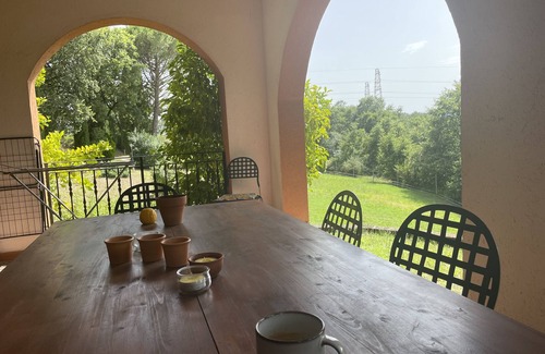 Casa Nel Bosco, a stately property suited for maximum 10 persons located between Bassano in Teverina and Orte (oldest village in Italy). Surrounded with 50 acres of private nature. 3 acres of garden, including pool, 20 olivetrees, citruses and 4 furnished terraces. The villas 2 upper levels provides kitchen, livingroom (with fireplace), hallway, 4 bedrooms and 2 full bathrooms. The ground floor consists of 1 bedroom, kitchen (with fireplace), livingroom and 1 full bathroom. Outside you have a breathtaking sceenery from the 4 terraces (1 is covered and 1 has a giant fireplace). The property is well equipped for your comfort and with an excellent wifi connection. Upon arrival the electric gates open and a cypress driveway welcomes you into this haven of tranquility. Short distance to nearby villages gives you easy access to shops, restaurants, sightseeing and lakes (30 min to Bolsena lake). 3 km to village, trainstation 10 min, car rental, 10 min, 70 km to Rome, 60 km to the sea.