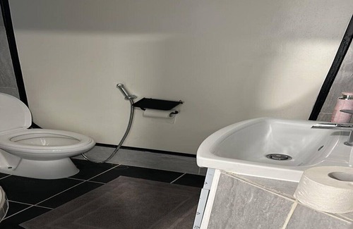 There is one bathroom, which has a toilet and sink and a walk-in shower.