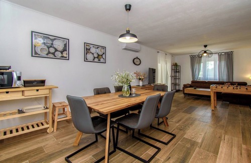 A beautiful holiday destination is located in Hrboki. Hrboki is a very quiet place, far from tourist crowds, but close to the city of Pula (20 km). The holiday house consists of 2 floors, but only the first floor is rented, while the second floor is closed and not accessible to other guests. The house is exclusively for your use.The ground floor of the comfortable and stylishly furnished holiday home consists of a living room with direct access to the outdoor area, a dining room, and a fully equipped kitchen. There are 2 bedrooms with double beds and 1 bedroom with two single beds. There is also a bathroom and a guest toilet.In the garden, there is a swing and a trampoline for our little guests. Bicycles are available, there is also table tennis, table football, and an outdoor volleyball net. The outdoor area features a covered dining area with a barbecue, where you can spend pleasant evenings. A private pool with loungers invites you to relax during hot summer days. On request, the pool can also be heated. The entire outdoor area of the holiday home is completely fenced and offers private parking.We wish you a pleasant stay at house Ondine. Distances: post office 5000m, emergency room 20000m, discotheque 20000m, hotel swimming pool 25000m, other sports grounds 20000m, gas station 5000m, restaurant 5000m, shop 3500m, center 4000m, sea 3000m, beach 3000m, airport 20000m.