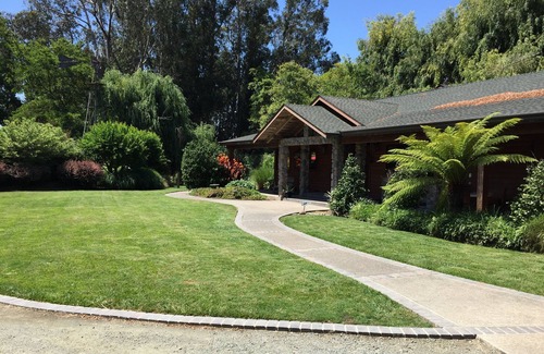 The main house is 4 bedrooms/3 full baths with a large (lodge style) Living Room and game room with pool table. There are 2 bedrooms with queen beds, a third bedroom with three twins, and the 4th master bedroom has a California King bed and contiguous full bathroom and walk-in closet. There is a furnished Guest House with 1bd 1ba plus Den that has a queen sofa bed for extra sleeping. The pool area boasts an inviting outdoor fireplace and a covered patio seating area. The landscaping at Casa de Blakeman is spectacular with its large weeping willow trees, private pond, expansive lawns, vineyard and pasture views all lending to it's unique park-like setting. It is truly a relaxing wine country retreat. We invite you to come and experience it!