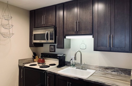 This condo has a fireplace, (firewood can be purchased at Vons, Rite Aid) outside deck, fully equipped kitchen, remodeled bathroom, stylish decor and furniture. The coffee table in the living room easily adjusts to dinner table height, turning the living room into a dining room for meals, card games, etc. The counter stools are adjustable to be used at the bar or dining table. The 50" smart TV swivels for viewing from living room/kitchen area or bed. Netflix, Amazon Prime, HBO Max, Hulu and Cable included. Bright and airy with two sliding glass doors that open to outside deck, a Ceiling fan and HEPA Air Purifier for added comfort and clean air.