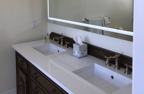 The bedrooms are fully furnished w William Sonoma Home or Pottery Barn sheets/towels. The two bedrooms upstairs are master bedrooms with private bathrooms en suite. These bathrooms are newly renovated with new everything, wonderful lighting and modern touches. Third bedroom is downstairs and has a bathroom just down the hallway. This bathroom has been nicely updated. Each bedroom also has own smart flat screen TV (w Netflix, Amazon etc). There is a closet system in each of the bedrooms. The house also has many smart home features, including Ring, Alexa, a smart lock and a smart thermostat.