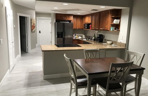 Suite is all newly renovated. Stainless steel appliances, granite countertops, walk in showers . Reclining sofa, 55 inch smart tv, well equipped kitchen , new linens, king and queen beds , new paint and window coverings. Safe and friendly gated community, bike or walk the rotary beach walkway or island .