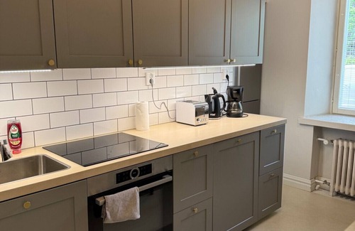 This apartment features a comfy living area, a fully equipped kitchen, a modern bathroom shower, and two separate bedrooms with double beds in each room (or other one can be divided into single beds). Living room has a 140 cm wide sofabed and extra foldable single bed can be arranged. Fast wifi and smart TV.