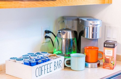 This home holds 6 guests comfortably. Included is a kitchen, dining table, and living room. There are three beds, one queen in the downstairs bedroom and one queen bed in the upstairs loft along with one full-size couch pull-out bed. Note that you must climb stairs for the loft, please see the listing photos for details. The kitchen is supplied with many spices, oil, coffee, and creamer. Also provided are pots and pans for cooking meals, a stove, microwave, toaster, fridge, silverware, and dishes.