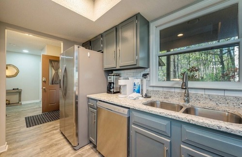 This charming woodland-themed condo features two cozy bedrooms and two beautifully lit bathrooms with modern amenities. Guests can enjoy a comfortable king bed in one room and a queen bed with a bunk bed in the other room. The kitchen is fully equipped with amenities such as a fridge, stove, microwave, traditional and Keurig coffeemakers , toaster and a range of pots and pans. You will have everything you need to cook and prepare meals for your stay. Whether you are a seasoned chef or just looking to whip up a simple dish, this kitchen has got you covered. The front porch has an inviting space with rocking chairs and a propane gas grill off the kitchen. Grill tools are provided. The back deck provides a tranquil space with furniture and a serene, wooded view. The condo comes equipped with WiFi, providing internet access for all guests. The condo features a designated space for laundry. This condo is the perfect spot for nature lovers looking for a peaceful retreat with modern amenities.