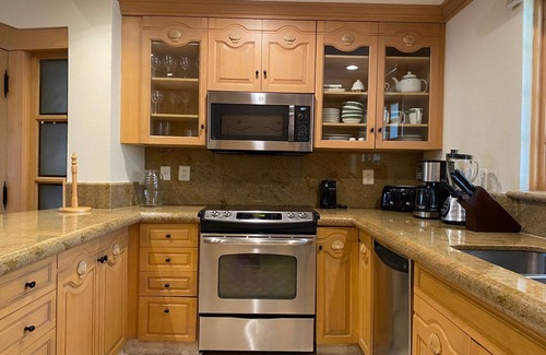 Dine in with a full kitchen complete with stove, oven,