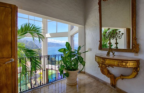 Spectacular 4 bedroom private villa breathtaking views of the coast, a great location, 10 minute’s walk to the beach & apro 5 minute drive to downtown Puerto Vallarta, full staff included.Each bedroom with private bath, AC, fan, (some have ocean view & terrace) Heated pool & Jacuzzi Full staff -Cook houseman/waiter & housekeeper WIFI, Telephone, local & long distance TV (Satellite service) (3 TV, 1 DVD) Stereo – ipod dock