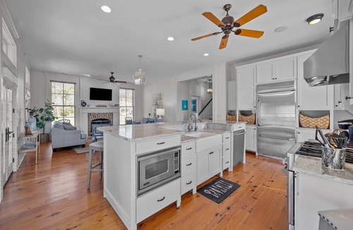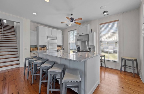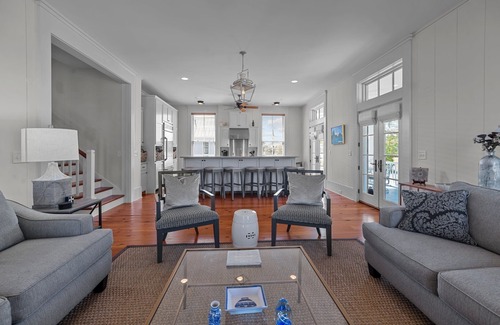 Big Red is located in the Master Planned coastal community of River Dunes in the Chapel Square. This four bedroom, five bath home allows for quick access to the River Dunes Harbor Club, amenities, and Grace Harbor. Big Red features a kitchen with stainless steel Viking appliances, coffee maker, utensils, serving dishes, plates and basic cookware. You will also find a welcoming front porch, one car garage, and screened in outdoor dining area. As you enter through the French front doors you will notice the reclaimed heart pine flooring, open downstairs floor plan, and high ceilings. On the first floor your will find three bedrooms - one king bed, one queen bed and one set of bunk beds - each with their own private bath. The second floor has a bunk room with two full size beds built into the dormers with space to entertain and relax as well. The property does have WIFI and streaming services for guests to use. The guest stay will come with linens and towels included.