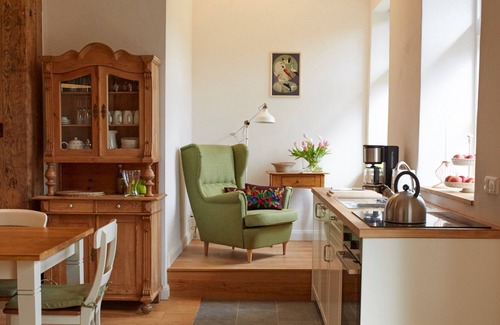 Fewos 2016 completed. Apartments are furnished with country style furniture and antiques in soft natural colors.
