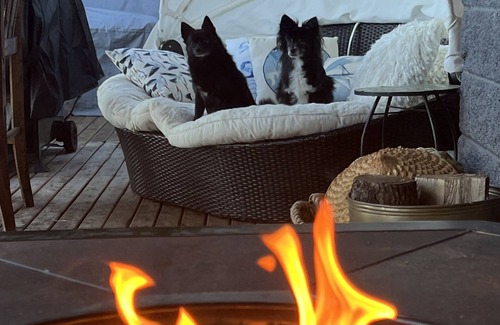 The private deck with a topless rail gives a fantastic, Island, mountain Eagle and sunset view! Outdoor furniture, with gas fire pit on the upper deck.