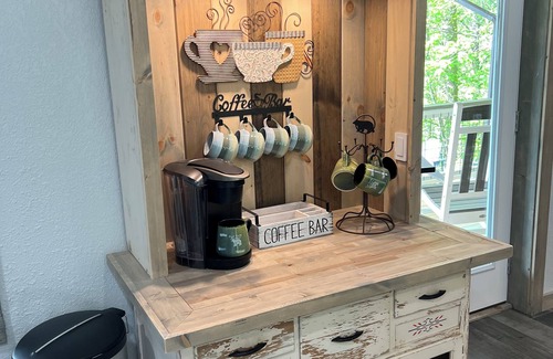 ~The kitchen is fully stocked with all the cooking and serving supplies you might need, including a blender, wine glasses, pots and pans and grilling supplies! We also offer a coffee bar with both a Keurig and regular coffee pots. We have provided K-cups, sweeteners and creamers as well as a tea pot and an assortment of teas.