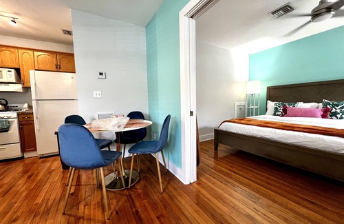 There are 4 historic cottages sharing the pool courtyard. Your villa has a private entrance, work desk, washer/dryer, king bed, kitchen, central air, parking, & high speed internet.