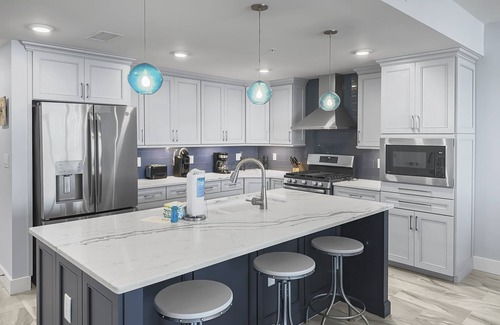 Designed to comfortably accommodate six guests, Blu 606 is a spacious retreat adorned with high-end furnishings to elevate your beach getaway. Flat-screen TVs in both bedrooms and the living room ensure entertainment delights before a cozy night's sleep. While Fort Walton Beach boasts tempting restaurants, Blu 606's incredible kitchen might just tempt you to channel your inner chef. Marvel at the large kitchen island, upgraded cabinetry, and stylish hand-laid subway tile. Quartz countertops grace the kitchen and both bathrooms, creating an atmosphere of pure indulgence.