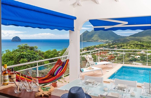 The terrace extends seamlessly from the villa, inviting you to enjoy the gentle tropical climate. With an exceptional view of Diamond Rock and the surrounding nature, it becomes a true living space. Opening onto the pool, the terrace transforms effortlessly into a lounge or dining area, providing a dreamy setting for relaxing, enjoying an aperitif, or sharing a meal with family or friends. The heated mosaic pool is an irresistible invitation to swim. Its sparkling, crystalline waters promise moments of pure relaxation. Equipped with an aquabike, it becomes your private open-air fitness center amidst a magical setting.Serenity and tranquility are at the heart of Villa Blue Line, ensuring you unforgettable holidays.