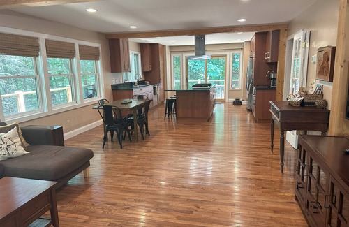 I know many of my guests love the multiple public, but private spaces this house includes due to 4 public rooms (versus the norm of 1 great room) and multiple-level decks and porches. There are many spots to find a private moment or change your view. My view is always the wooded wonderland.
