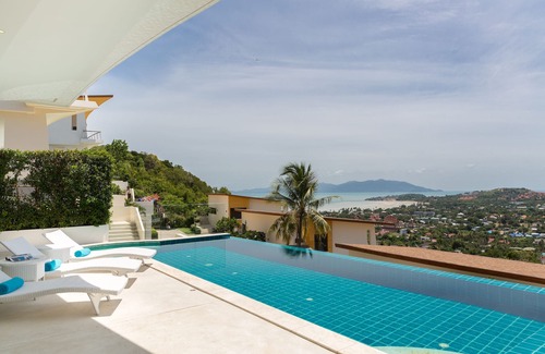 Exquisite private luxury villa with breathtaking panoramic ocean views of gorgeous Koh Phangan from the infinity pool. Blue Sapphire Ocean View is an award-winning, cheerful and airy villa high-up in an enclave of high-end residential villas, boasting views across the Choeng Mon Peninsula, Wat Plai Laem Temple and the Gulf of Siam’s shimmering waters. This villa boldly spans three floors of accommodation and showcases inside-outside living at its very best. The breathtaking scenery affords the daily extravaganza of changing blue skies from the main living space and pool terrace. Three fully appointed bedrooms are located on the top floor of the villa, all with private sea-view balconies; the fourth bedroom is a self-contained studio apartment is on the lower ground floor. Each of the bedrooms features a stylish and spacious en-suite bathroom. For additional privacy, the studio apartment has a fully fitted kitchen, living area and terrace. The main living space is open plan, with soft lighting, a fully equipped contemporary kitchen with breakfast bar and dining areas. This impressive villa affords the luxury of communal spaces but also allows for seclusion with separate bedrooms and terraces on each floor. Create unforgettable holiday memories at Blue Sapphire Ocean View with this sublime holiday home and exceptional service from the welcoming management team who are always on hand to arrange exploratory trips by land or sea.