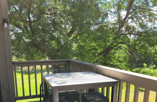 This lovely upper story condo features a queen bedroom with full bath, queen bed loft with a full bathroom, electric fireplace, outdoor balcony, Wifi, Roku, east side location and so much more!