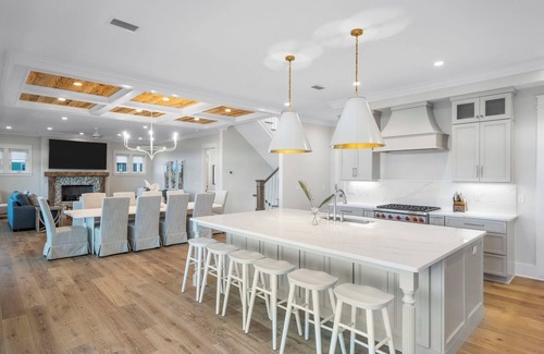 The elegant great room resides on the third level, featuring a wall of windows that spans the room and offers breathtaking views of the shimmering water and picturesque St. Vincent Island. The designer kitchen is a chef’s delight with a Wolf gas stove, wine cooler, and an expansive island that doubles as a breakfast bar for 6. A 10-seat dining table beneath a coffered ceiling separates the kitchen from the living space, which boasts a mix of soft seating, an 86” Smart TV, and a gas fireplace. On the balcony, multiple Adirondack chairs and 2 patio tables invite alfresco meals and tranquil evenings watching the sunset. When it’s time to retire, guests will find 1 guest bedroom with a king bed and private bathroom on this level.