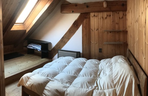 At the first under the roof, 2 perfect rooms for couples and a large room with 2 beds one sliding bed plus a bunk bed (bathroom / WC accessible from the 3rd bedroom)
