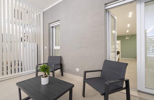 Welcome to this modern and minimalist apartment, thoughtfully designed to offer comfort, style, and functionality. The space features a cozy bedroom highlighted by a calming blue accent wall that adds a touch of personality and warmth. The bathroom is sleek and elegant, with a refreshing leaf-patterned shower that brings a subtle hint of nature indoors. The heart of the home is the open-plan living room and kitchen, adorned in neutral tones that create a soothing and spacious atmosphere—ideal for relaxing, entertaining, or working from home. The entryway is clean and welcoming, featuring a beautiful wooden door and convenient access via an elevator, adding to the apartment’s overall ease of living. Step outside to a stylish private patio, where simple black furniture and a small potted plant create a perfect setting for morning coffee, evening wind-downs, or quiet reading time. Every detail of this apartment is carefully curated to reflect a modern lifestyle with a minimalist aesthetic. Ideal for solo travelers, couples, or professionals, this home offers a peaceful retreat while being conveniently located close to essential amenities, public transportation, and local attractions. A perfect blend of comfort, elegance, and practicality awaits you.