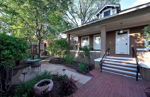 Located in the renovated historic 1910 Territorial House, you will enjoy the crisp Santa Fe light that enters from the south facing windows. The King size bed, exquisitely appointed, is draped with an Aguayo and matching pillow set; a woven textile from the Andes. Luxuriate in the spacious limestone bath that includes a large shower and high-end bath accessories. The wood floors have been renovated to their original glory, the walls adorned with woven tapestries and a collection of handwoven baskets. Each weave tells a different story and the history of the Pueblo Indians can be seen in each design. Enjoy an afternoon cup of tea or read in the beautifully upholstered matching lounge chair set. The private garden is complete with a table and chair set. The entrance to the Olive Tree is private. Visit the Santa Fe Railyard where trains first arrived in the 1880's. Traveling with friends? The Sunset Suite includes the Olive Tree Room and the Territorial Suite which can be booked simultaneously to expand your space to 1000 sq. ft.