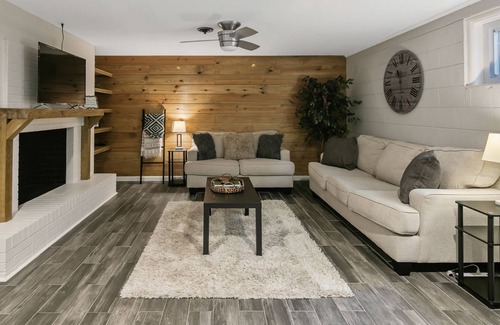 Step into the Bunker and you’ll feel at home right away. A natural wood accent wall gives the living room a warm, farmhouse feel. The giant comfy couch (big enough to sleep on) and loveseat will accommodate the whole group for game night; enjoy your favorite movies on the 50-inch Smart TV. The living room is so big, there’s plenty of room for an air mattress for extra visitors. The large bedroom offers a king-size bed and a cushy recliner. Fully equipped with updated appliances and a bistro table, the kitchen includes a complimentary coffee station. Amenities include WiFi, air conditioning, ceiling fans, convenient washer/dryer combo and a communal patio with chiminea and BBQ grill in the side yard. Dogs are welcome (no cats). Your stay also includes access to a shared gym (open from 8am to 8pm).