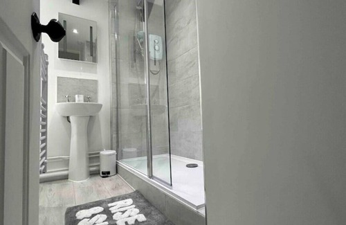The bathroom has a large walk in shower, heated towel rail, mirror light with soaps provided