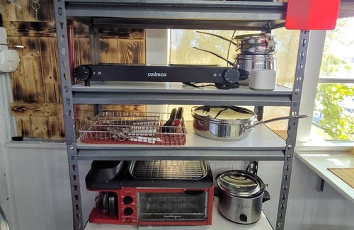 This bus was converted in 2021, giving it modern style full of charm and comfort. It is equipped with electric heating & 2 window A/C units. The shower has a handheld wand & a tankless water heater for instant hot water. A built in vanity, provided hair dryer, top dollar paper goods, provided clothes hangers, electric appliances, Keurig & a variety of flavors, sugar & creamer, along with oil & spices plus extra linens and pillows really seal the deal!