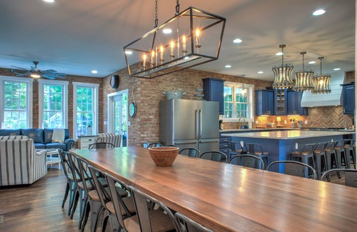 You will feel right at home as you enter the grand two-level entryway along with the rustic details and the modern touches. There is plenty of space for all, including a spacious Great room with a large sectional, large screen TV and electric fireplace to take in a game or movie. The Keeping room off the kitchen is lovely with 2 comfortable leather sofas with tons of natural light. The kitchen is fully equipped, all stainless-steel appliances, including 2 refrigerators, 2 dishwashers and a wet bar & drink fridge. A custom-built dining table and large island with bar seating is where everyone will want to gather and enjoy a meal.