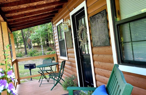 This cabin has a queen bed and sitting area. If you have 1 or 2 little ones, there is room for an air mattress. We pride ourselves in an exceptionally clean accommodation. There is a refrigerator, microwave, charcoal grill, queen size bed, fresh towels, shampoo, conditioner, body wash, full bath with tub and shower, front porch, and easy access to the highway.