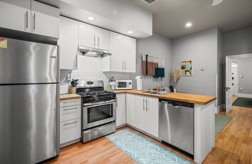 When you walk in, you'll be greeted in the foyer with a welcome kit that includes all of your necessities (restaurants, tourist locations, parking pass, important numbers, etc.). Unit 2 will be straight ahead and your home for the duration of your stay. Enter your large room that has a king-size bed and a 55" smart TV equipped with Netflix. Then walk into the open living room and kitchen where an additional single bed can be found. Need another bed? Find a roll away single bed in the bedroom closet. Just around the corner, you will find the modernly updated bathroom with a walk-in shower and linen closet packed with all of your essentials.