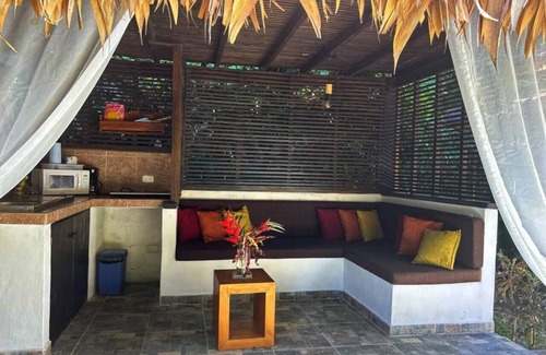 This charming property features two separate queen-size bungalows, each with elegant travertine marble flooring that adds a touch of sophistication. Both bungalows are equipped with a private bathroom, ensuring comfort and privacy for guests. The roof material, height and fan keep the interior cool and air conditioning unnecessary, and maintain a fresh and pleasant atmosphere, perfect for relaxing after a day of exploring. At the centre of the property is a beautiful swimming pool, surrounded by a garden that enhances the natural beauty of the surroundings. This garden is not only an ideal place to enjoy the sun, but is also a refuge for local wildlife. Agutis and small amphibians are common sights, and with a bit of luck, howler monkeys can be spotted in the nearby trees, adding an exotic and vibrant touch to the experience. The property also includes a small outdoor kitchen, ideal for preparing snacks and drinks while enjoying the outdoors. The combination of the outdoor kitchen, lounge chairs and pool creates a perfect environment for leisure and fun, making this property an ideal retreat to relax and enjoy nature.