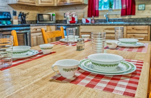 A large eat in kitchen has a dining table provide for wonderful family dinner. After dinner tell ghost stories and roast marshmallows while sitting around the firepit right down next to the creek.