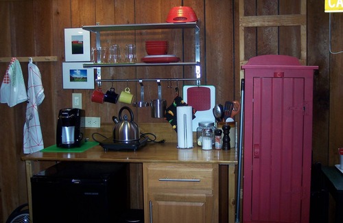 Located in historic Byrdcliffe, surrounded by forever wild land, attached studio cabin features rustic charm, a single bed, tiled bath with shower, Huge skylight, private entrance, a kitchenette with coffeemaker, fridge, hot plate, A/C, private patio w BBQ. For singles only. Seasonal.