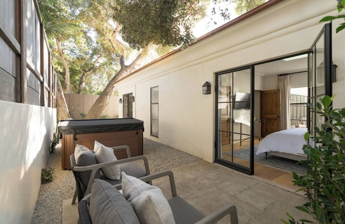 Your dream getaway awaits at Cabaña de Laurel, an inviting two-bedroom cottage combining natural elegance with modern conveniences. Enter your private oasis through a charming courtyard, a spacious retreat complete with lounge chairs for relaxing under the California sun. Once inside, the open-concept interior captivates with abundant natural light, modern earth tones, and inspiring architectural details, including striking ceiling beams, European oak floors, and exquisite high-end finishes that define the home.
