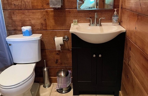 This charming cabin has an open studio floor plan with a separate bathroom/shower. It has a large covered back porch with a beautiful view of the valley, mountain ridge, and pond in the distance. The cabin has a queen sized bed as well as a futon sofa that flattens to an extra sleeping area. All bed linens, bathroom towels, toilet paper, complimentary shampoo and soap are provided. Enjoy the comfortable, contemporary furnishings. The cabin has a dining nook as well as a fully stocked kitchenette with double burner cooking hotplate, keurig coffee machine, toaster, electric hot water maker, microwave, half fridge, and all pots/pans/dishes/utensils. It is fully air-conditioned/heated. Enjoy an evening barbecue on your private charcoal/wood burning grill outside your front door. Enjoy the open feel of this cabin with all the conveniences of high-speed wifi and cable tv, after enjoying a day packed full of the many outdoor activities Sky Retreat offers.
