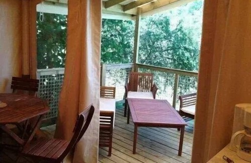 Accommodation: Roofed bungalow for 5 people that offers an exceptional view!2 bedrooms, one with 1 double bed 140x190cm and the other with 2 bunk beds 80x190cm and a single bed 80*190, both are equipped with a storage column with shelves and a bedside lamp.Kitchenette open to the living room with refrigerator top table + freezer, 2 gas hobs.Covered terrace with exotic wooden garden furniture (a coffee table, 2 armchairs and a bench bench)The living room and terrace can be combined.Our groomed bungalows have no water or sanitary facilities. Sheets not provided, pillows and duvets made available in the tent. Cleaning on the day of departure and at the charge of the tenant. Arrival from 3pm and departure at the latest at 10am.All prices displayed are without tourist tax 0.50 € p.p.p.n. from 18 years old.