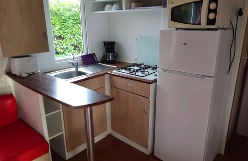 Accommodation: Mobile home (39m2) includes 3 bedrooms, a living room + an American kitchen, a toilet, a bathroom (shower), a semi-covered terrace with garden furniture. The kitchen is equipped with a 4-fire gas, a microwave, a hood, a refrigerator/freezer, + dishes + a TV connection. the 1st and 2nd bedroom contains 2 beds of 80 - the 3rd bedroom contains a bed of 140. Covers and pillows provided - Sheets and sheets are not provided.