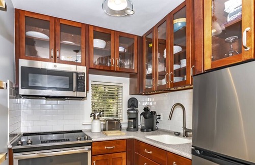 Recently upgraded and professionally decorated. Home has two master bedrooms. A crisp and refreshing bedroom with queen bed and tiled en-suite private bath greets you on the first floor. Sunlit filled living area on main level is cozy and comfortable with kitchen and dining adjoining. Upstairs suite is spacious bedroom with king bed and additional day bed with trundle.