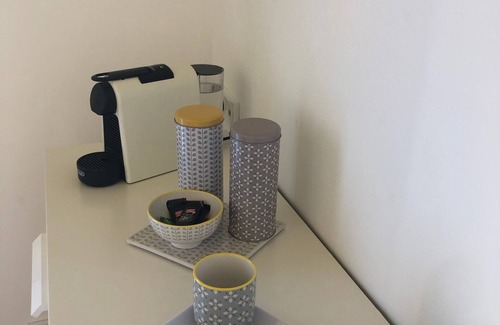 A modern kitchen style glass, high bar and high stools, very well equipped for cooking (induction hob, microwave, oven pyrolysis, fridge-freezer, deep fryer, coffee pod, electric kettle, toaster, thermomix robot and lava -dishes) and for the laundry (washing machine, tumble dryer, iron and ironing board)