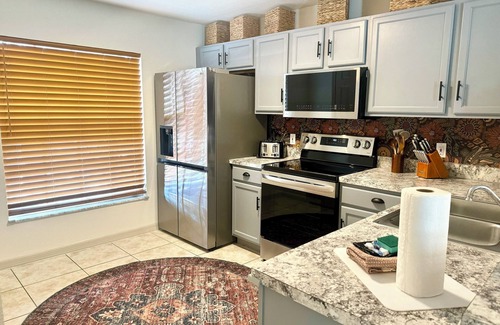 - Amenity/starter pack provided (tea, coffee, sugar, milk, juice/soda, cookies, chips, paper towel, one toilet roll per bathroom, small dish soap, sponge, hotel size soap and shampoo, 2 dishwasher tablets, small laundry detergent, trash can liners in each trash can.