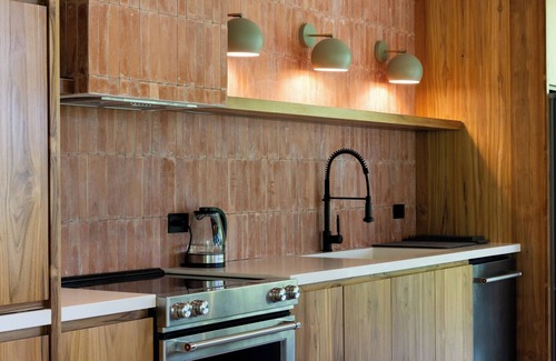 Surrounded by the lush jungle, DosSantos is designed for seamless indoor-outdoor living. The open-plan layout features floor-to-ceiling windows, filling the home with natural light and creating a connection to the stunning natural surroundings. The warm, earthy design brings together modern simplicity with natural elements, creating a space that feels both sophisticated and welcoming.