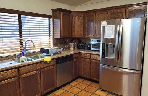Large single story home with a spectacular view of Rio Rico valley. Over 2700 SQFT of living space with lots of amenities. 4 bed 2 bath with two large living areas. Tv's in every bedroom with streaming services. Front yard is fenced in, back yard is not. there is a lot of wild life in the area and come up to the back yard to get a drink of water from our fountain. Ring door bell and cameras on the outside of the house. Please no parties or reunions allowed. House is under constant renovation, some materials may be stored in the garage or on the driveway but rest assured it will have very little impact on your stay.